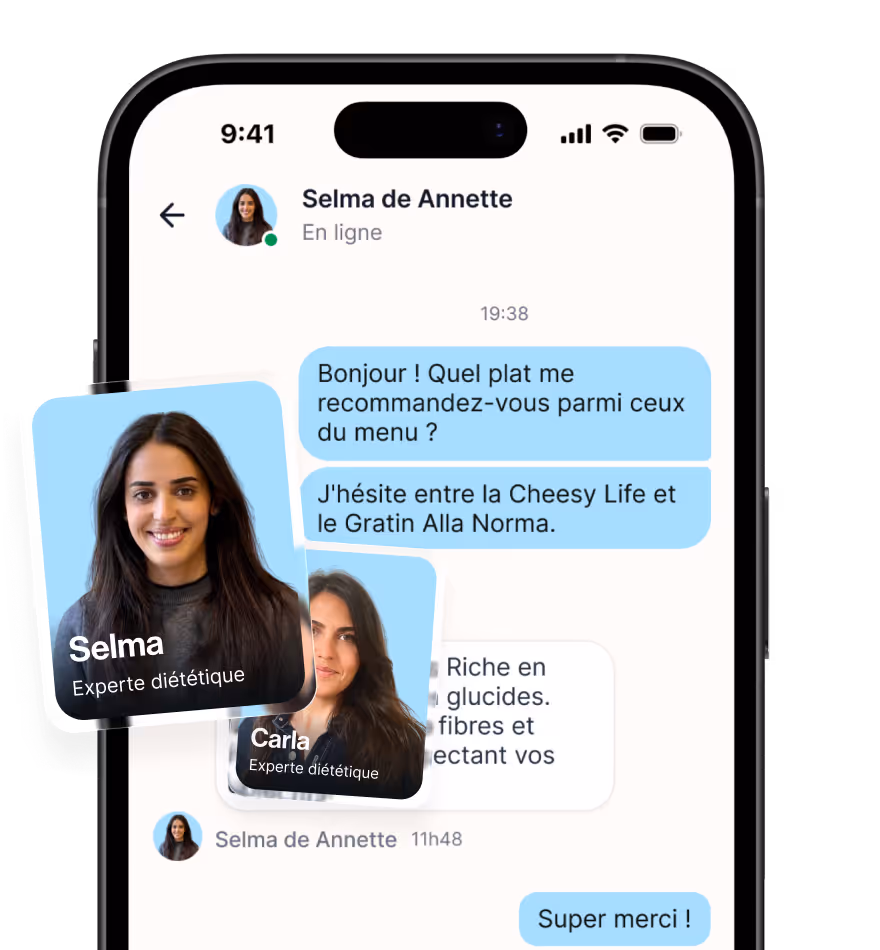 Vous accédez ensuite à l’application Annette, qui vous relie directement à une équipe pluridisciplinaire — professionnels de santé, experts du comportement alimentaire et de l’activité physique.